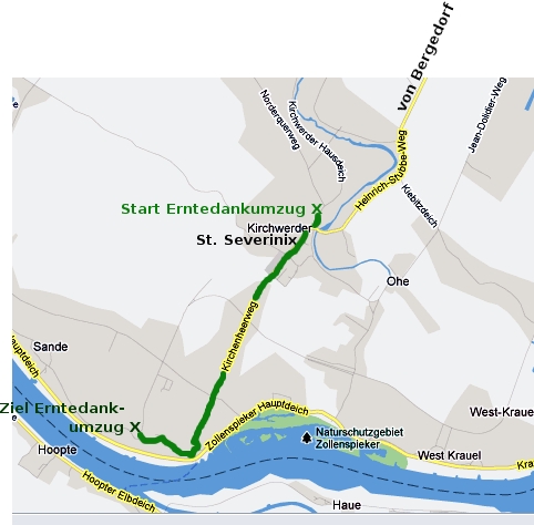 Strecke: Norderquerweg – rechts in den Kirchenheerweg – nach Süden bis zum Kirchwerder Elbdeich – Kirchwerder Elbdeich bis Spieker Markt (Am Sülzbrack). Ankunft ca. 15 Uhr.