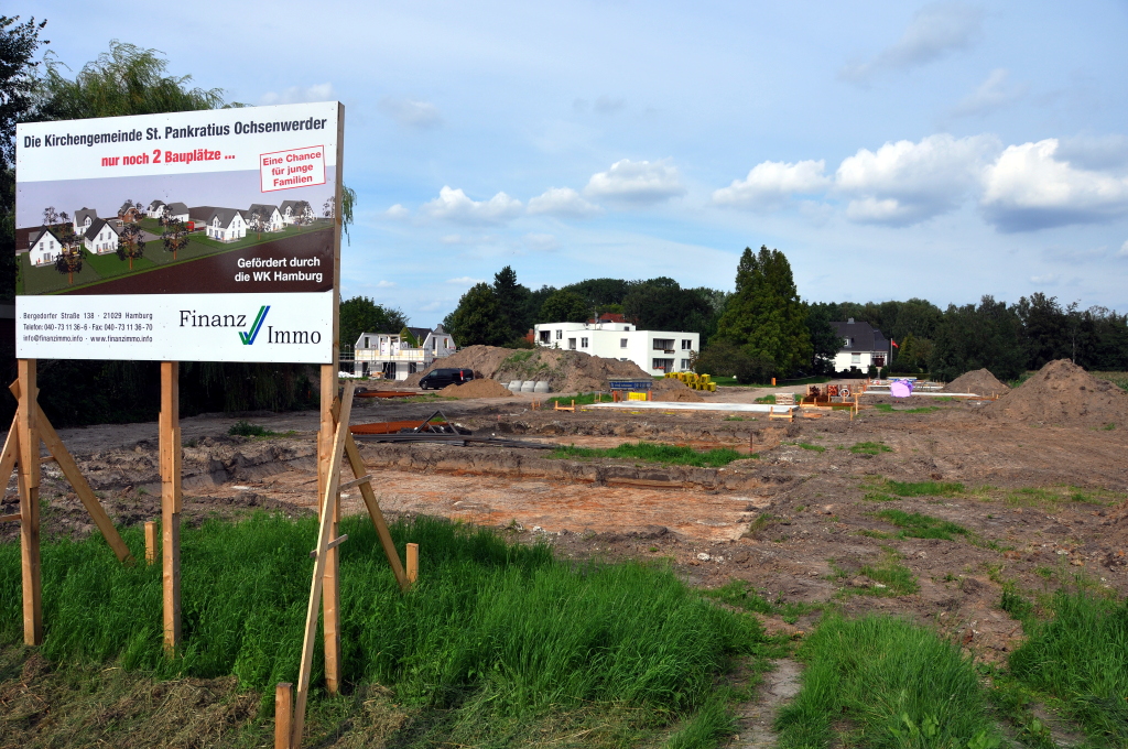 13 Einfamilienhäuser sollen auf dem Land der Kirchengemeinde St. Pankratius Ochsenwerder entstehen. 11 davon sind bereits im Bau. Der Verkehr, den die neuen Nachbarn mit sich bringen werden, soll über die Graumanntwiete fließen, denn eine direkte Anbindung an den Ochsenwerder Landscheideweg ist dem Vernehmen nach nicht vorgesehen.