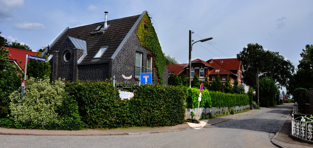 Entsprechend wurde die Graumanntwiete mit Halteverbot belegt, denn sie ist nur wenig breiter als ein LKW und parkende Fahrzeuge würden den Baufahrzeugen den Weg versperren. Der Gehweg, den es nur auf einer Seite gibt, ist ebenfalls recht schmal. Die Schilder wurden so aufgestellt, dass sie den Gehweg maximal ausnutzen (siehe Foto). Eine intelligentere Aufstellung dieser Schilder könnte die Situation etwas entspannen, denn wenn die Schilder nicht mitten auf dem Gehweg stünden, sondern dicht am Gartenzaun und die eisernen Fußplatten um 90 Grad gedreht, dann würden sie wenigstens Fußgängern und Kinderwagen nicht den Weg versperren.
