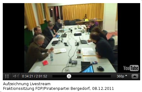 Mit der Übertragung vom 8. Dezember 2011 möchte die Fraktion ihren Antrag auf Live-Übertragung (PDF) der öffentlichen Teile der Bergedorfer Parlaments- und Ausschusssitzungen unterstützen. Nach dem Motto »Ein Bild sagt mehr als 1000 Worte« demonstrierte sie, wie so eine Live-Übertragung funktionieren kann und wie sie wirkt. Die Aufzeichnung fand mit Hilfe einfachster Technik statt, also mit einem Standard-Notebook, einer billigen Webcam und einem einfachen Standmikrofon. Die Übertragung besorgte einer dieser UMTS-Sticks, wie sie heute weit verbreitet sind, über den Streaming-Server, den die Piratenpartei kostenlos zur Verfügung stellte.