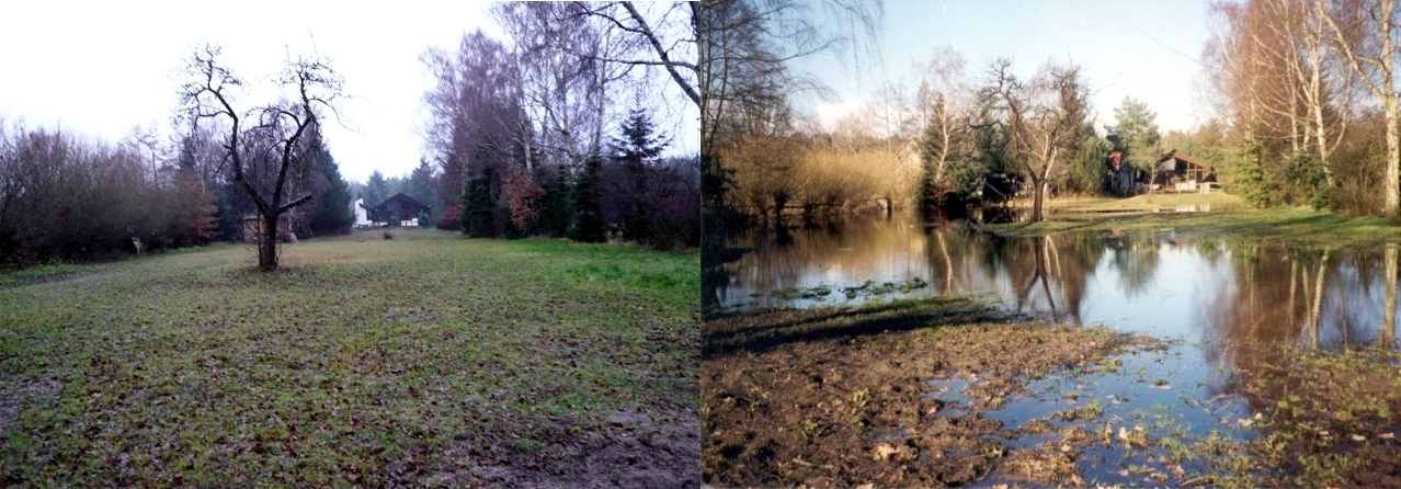 Kiefernweg, Vossmoor, bei normalem Wasserstand (Dezember 2007) und während Hochwassers (Februar 2002).