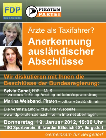 Die Piratenpartei (PP) will damit ein für allemal Schluss machen und setzt sich auf allen politischen Ebenen dafür ein. Gemeinsam mit ihrem Fraktionspartner FDP laden die Bergedorfer Piraten zu der Diskussionsveranstaltung »Ärzte als Taxifahrer? Anerkennung ausländischer Abschlüsse« am 19.01.2012 um 19 Uhr in den Räumen der TSG Sportvereins (Adresse Billwerder Billdeich 607) ein. Dort werden Sylvia Canel (MdB FDP, im Ausschuss für Bildung, Forschung und Technikfolgenabschätzung) und Marina Weisband (politische Geschäftsführerin Piratenpartei) die Beschlüsse der Bundesregierung zur Anerkennung ausländischer Berufsabschlüsse diskutieren.