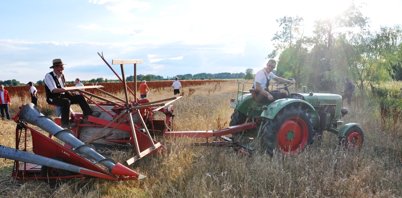 Weizenernte bei Krümse mit LANZ Mähbinder, den ein FENDT Dieselross zieht. Das Prinzip des Mähbinders wurde im Jahr 1872 von dem Amerikaner Charles Withington entwickelt. In Deutschland war er vor allem nach dem letzten Krieg bis in die 1960er-Jahre hinein im Einsatz und wurde erst vom Mähdrescher verdrängt. Der Mähbinder schneidet das Getreide und bündelt es automatisch in Garben, die später zum Trocknen aufgehockt werden. Wenn die Garben weit genug durchgetrocknet sind, werden sie geöffnet und die Körner ausgedroschen