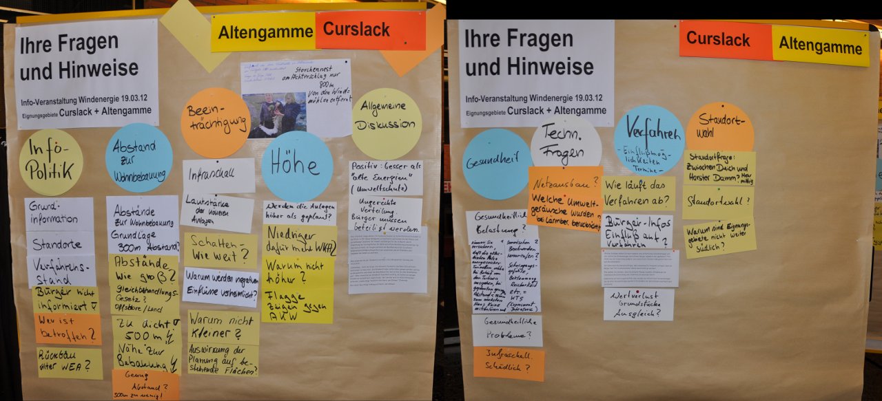 Wie schon bei den beiden vorangegangenen Veranstaltungen in Ochsenwerder und für Neuengamme hatten die Bürger im Vorfeld die Möglichkeit, ihre Fragen und Wünsche auf Kärtchen für die Metaplan-Tafeln zu schreiben. Im Unterschied zu den Ochsenwerderanern und den Neuengammern meldeten die Bürger dieses Mal einen deutlich höheren Bedarf an grundlegenden Informationen an. Außerdem, und das war neu, gab es nicht nur Fragen, Wünsche und ablehnende Bemerkungen, sondern auch Zustimmung: »Positiv: besser als "alte Energien"« hieß es da und: »Warum nicht höher? Flagge zeigen gegen AKW«.