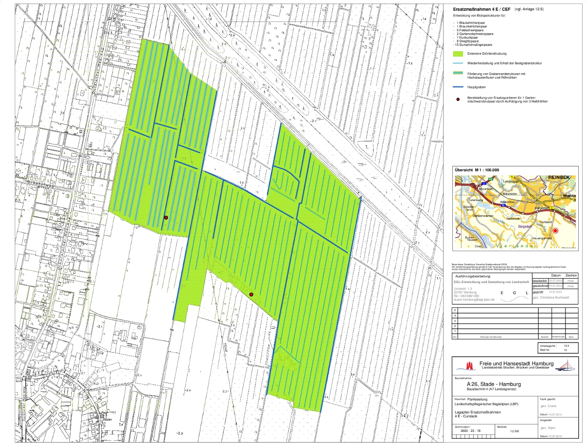 Zur Erinnerung: Die Planunterlagen liegen samt den Unterlagen über die Umweltauswirkungen noch bis zum 7. November 2012 zur Einsicht auch im Bezirksamt Bergedorf (wegen der Ausgleichs- und Ersatzmaßnahmen), Wentorfer Str. 38a, 21029 Hamburg, 1. OG gegenüber Raum 115, (Montag und Dienstag von 8:00 Uhr bis 13:00 Uhr und 14:00 Uhr bis 16:00 Uhr, Donnerstag von 8:00 Uhr bis 13:00 Uhr und 14:00 Uhr bis 18:00 Uhr, Freitag von 8:00 Uhr bis 12:00 Uhr) aus.