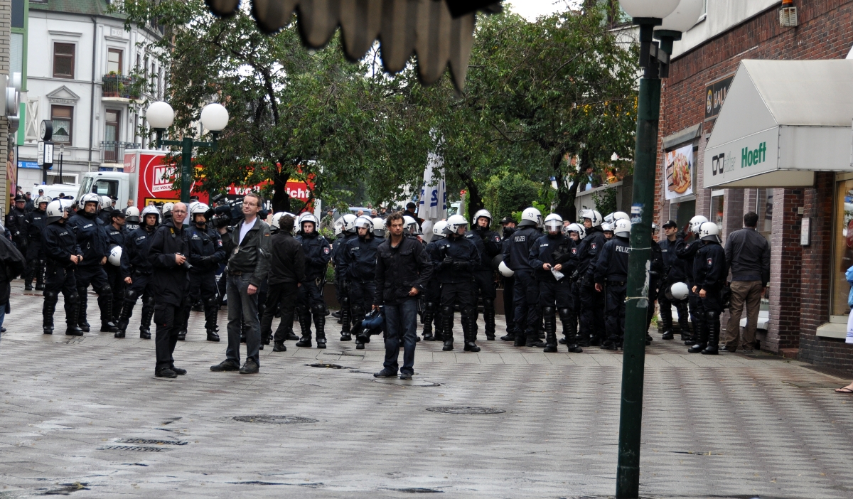 Von seiten der antifaschistischen Bürgerinnen und Bürger verlief die Demo friedlich; einen kleinen Tumult ohne weitere Blessuren gab es, als rund ein Dutzend Menschen mittendrin aus dem Hallo-Pizza-Laden auf den Platz strömten und sofort von der Polizei in den Harderskamp abgedrängt wurden. Viele Gespräche liefen zwischen Gegendemonstranten und Polizisten ab. Warum die Nazis überhaupt hier auftreten dürfen, fragte einer einen blau Uniformierten. »Wir haben das Recht auf freie Meinungsäußerung« war die Antwort. »Freiheit endet da, wo die Freiheit anderer anfängt.«, sprach ein älterer Herr aus Bergedorf und wurde nicht müde, mit Rufen und Pfeifen seinen Widerspruch kundzutun. »Warum nicht einfach ignorieren, diese Ewiggestrigen?«, fragte ein Passant und kritisierte die Gegendemonstranten dafür, dass sie den Nazis überhaupt Aufmerksamkeit schenken. »Das mit dem Ignorieren hatten wir schon mal, von 1923 bis 1933...«, war die ernüchternde Antwort, die den Kritiker dann auch gleich überzeugte.