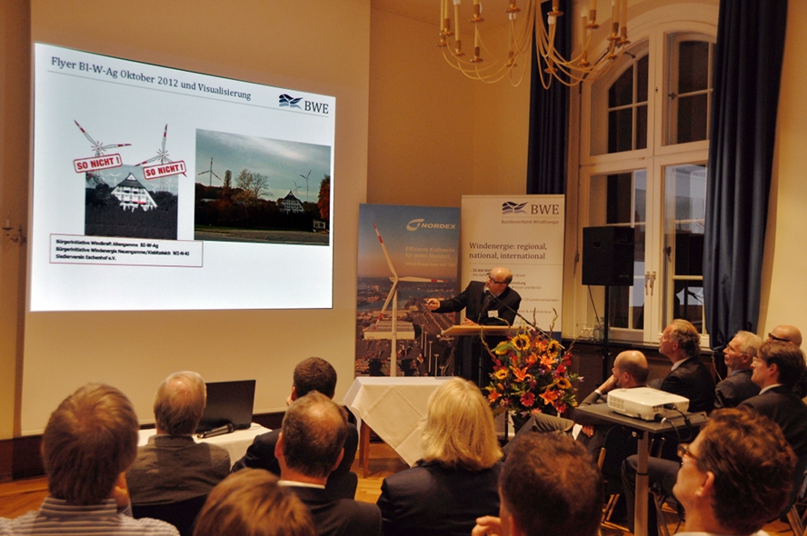 Der Präsident des Bundesverband für Windenergie (BWE), Hermann Albers, gab einen interessanten Einblick in nationale und internationale Energiepolitik und -wirtschaft. Sehr irritiert zeigte sich Albers über die Launen des Wirtschaftsministers Rösler, dem er EEG-Harakiri vorwarf. Er forderte eine Chancen- statt einer Risiko- und Kostendiskussion und machte am Beispiel der umlagebefreiten energieintensiven Industrie deutlich, was er damit meinte. Diese Energie-Großverbraucher seien derzeit sogar dreifach bevorteilt: Erstens von der Umlage befreit, zweitens (was diese Unternehmen gern verschweigen), durch den sog. merit order-Effekt, durch den sie den Strom aus erneuerbaren Quellen um 2 Cent billiger als noch vor 2, 3 Jahren an der Strombörse einkaufen, und drittens, gerade bei der Stahlindustrie, sie in der Erneuerbaren-Industrie den größten Abnehmer ihrer Produkte haben. Albers forderte kein neues EEG vor der nächsten Bundestagswahl und hielt mit seiner Kritik an Schwarz-Gelb kein bisschen hinter dem Berg: »Ich habe fast das Gefühl, wir haben ein wenig Gelbfieber, und ich hoffe nur, dass daraus nicht auch noch Schwarzmalerei wird.« (Um das Märchen von zu hohen Strompreise zu verstehen, sei die Lektüre der Studie des Harms-Gutachtens im Auftrag der Grünen im Bundestag [PDF] empfohlen.)