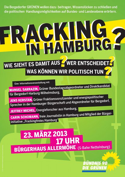 Seit die Informationen über die erteilte Aufsuchungserlaubnis im Hamburger Süden bekannt geworden sind und klar ist, dass der Konzern ExxonMobil großes Interesse an Norddeutschland hat, treiben viele Fragen die Bürgerinnen und Bürger in den betroffenen Gebieten um. Erste Informationsveranstaltungen haben bereits fachliche Informationen zu der Methode des Frackings geliefert, aber der Klärungsbedarf bleibt weiterhin groß. Die Hamburger GRÜNEN wollen dazu beitragen, Wissenslücken zu schließen und die politischen Handlungsmöglichkeiten auf Bundes- und Landesebene zu erörtern.