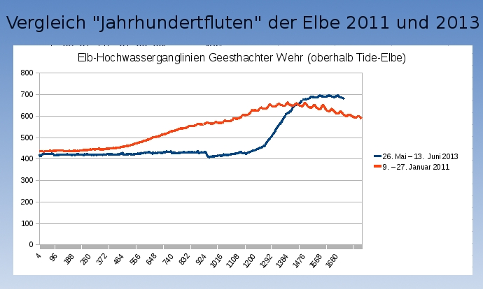 Hier sieht man, dass die aktuelle Flutwelle in Höhe Krümmel/Geesthacht gut einen halben Meter höher aufläuft als die im Januar 2011
