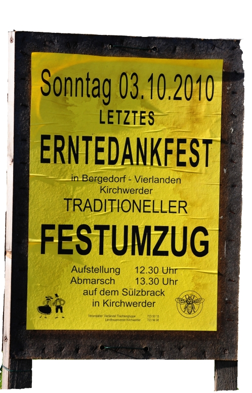 Ankündigungsplakat Erntedankumzug Kirchwerder 2010«Erfunden» hatten den Erntedankumzug zwei Vierländer Vereine: Die «Vierländer Trachtengruppe», heute eine Abteilung des «Sportclub Vier- und Marschlande», und der Ortsverein Kirchwerder des «Hamburger Landfrauenverbandes». Gerd Nissen schreibt¹ dazu: «1976 trafen sich Anne Albers, Vorsitzende der Kirchwerder Landfrauen, und Gerd Nissen, Leiter der VierländerTrachtengruppe, um über ein gemeinsames Erntedankfest zu diskutieren. Tante Anna, wie Anne Albers liebevoll genannt wird, hatte den Wunsch, dass der Umzug bei der Kirche endete, worauf dann der Gottesdienst folgen sollte. Wir wurden uns schnell einig. Auch Pastor Sach, ganz neu in Kirchwerder, stimmte zu.»